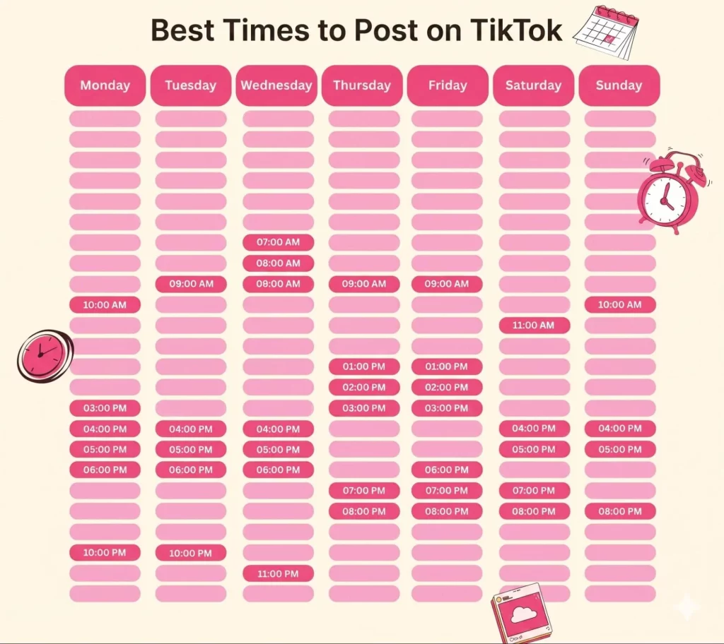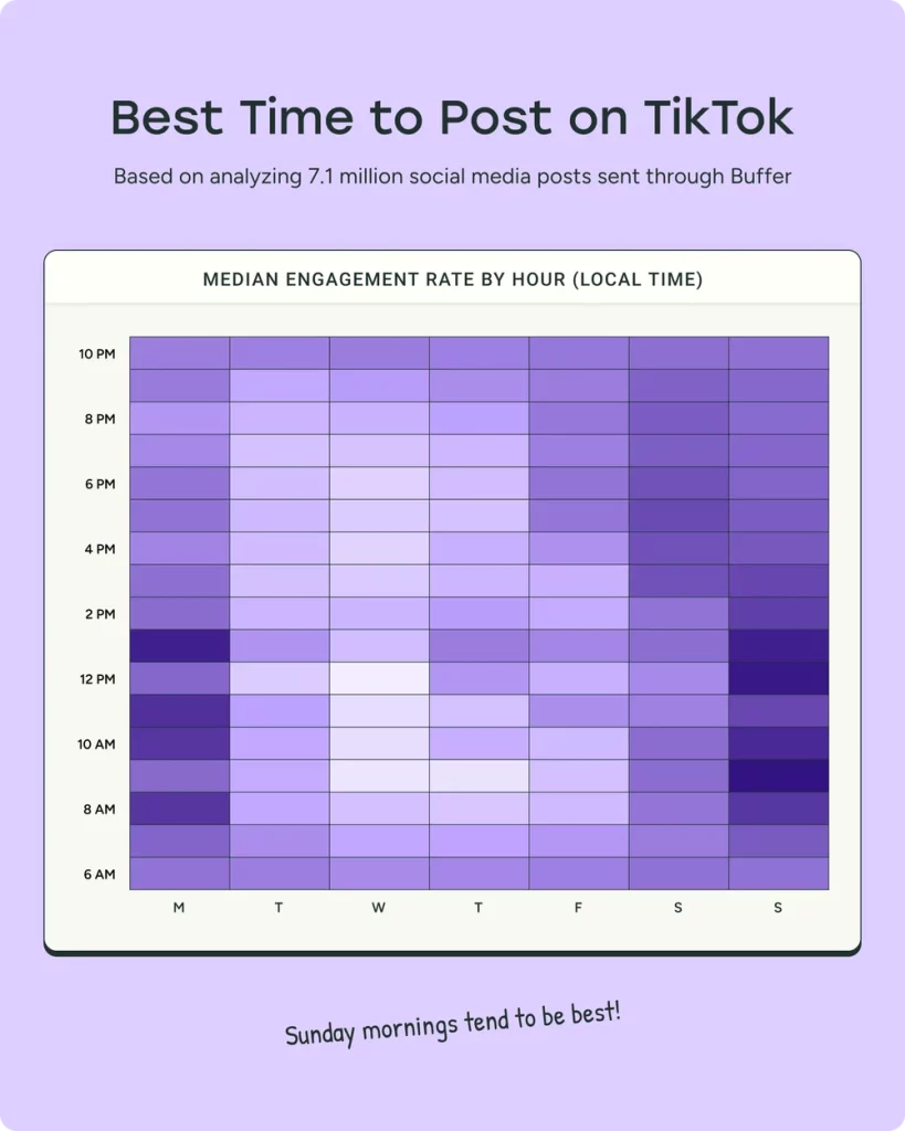 - Global data suggests Sunday mornings and weekday afternoons are highly effective times to post on TikTok.
