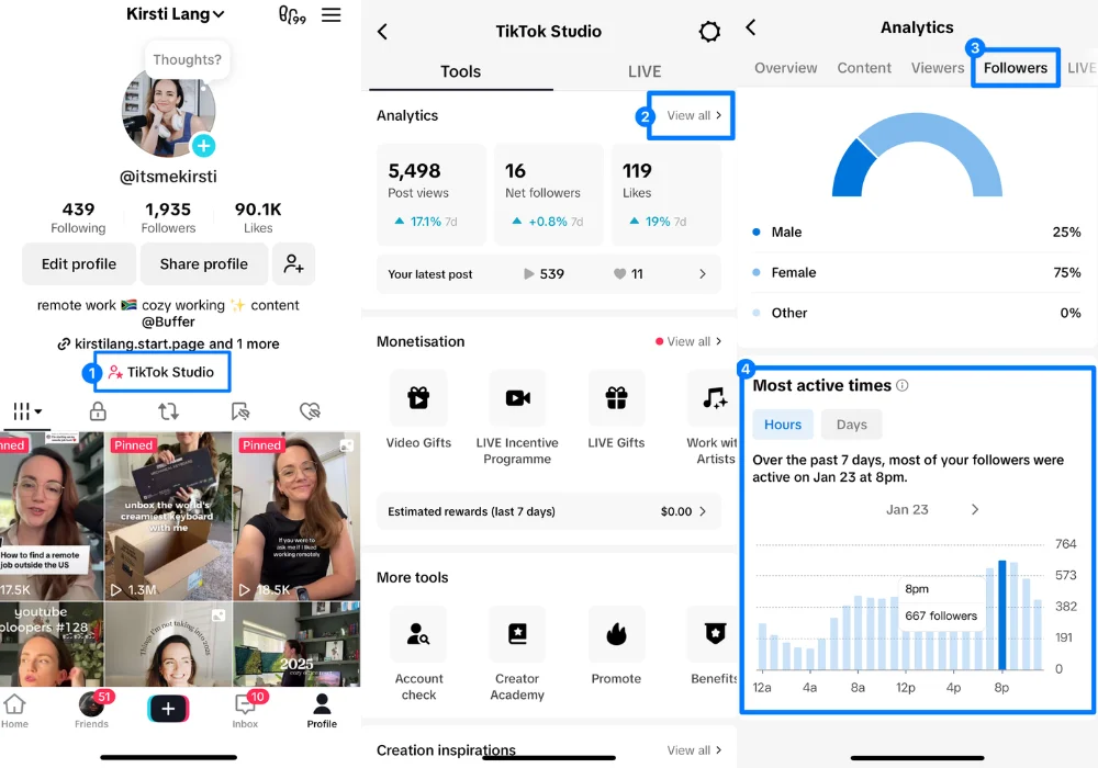Head to your profile and tap TikTok Studio. Navigate to Analytics > View all > Followers tab, and scroll down to Most active times. This reveals when your followers were online over the past 7 days. Posting when your target audience is most active gives your content the best possible chance to trigger the FYP algorithm.