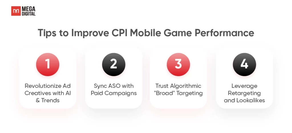 - Creative Performance: High-quality ads that boost Click-Through Rates (CTR) directly signal relevance to algorithms, effectively lowering your final CPI. At Mega Digital, we consistently find that AI-optimized creatives can lower CPI by up to 30%.