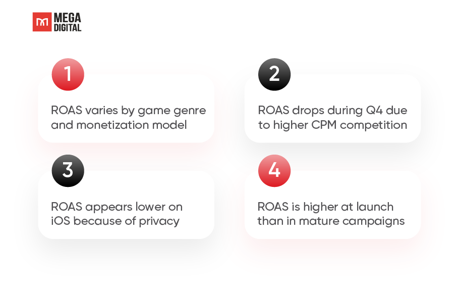 Contextual factors affect ROAS interpretation including game genre, seasonality, operating system (OS), and campaign maturity.