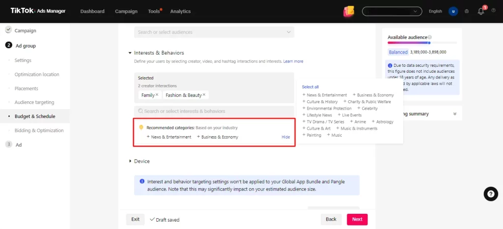 When setting up an ad group, TikTok analyzes your industry and past performance to suggest relevant Interest and Behavior categories. This acts as a guided assist, ensuring you don’t miss obvious audience segments.