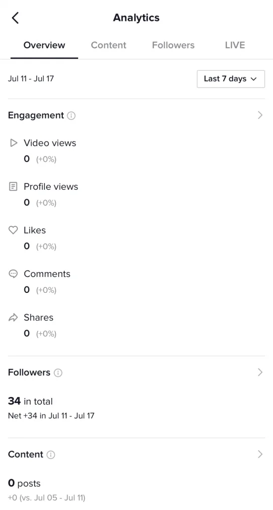 In the Overview section, it demonstrates follower growth, video views, profile views, likes, comments, and shares for the previous 7, 28, or 60 days. You can also choose a custom date range up to 60 days.