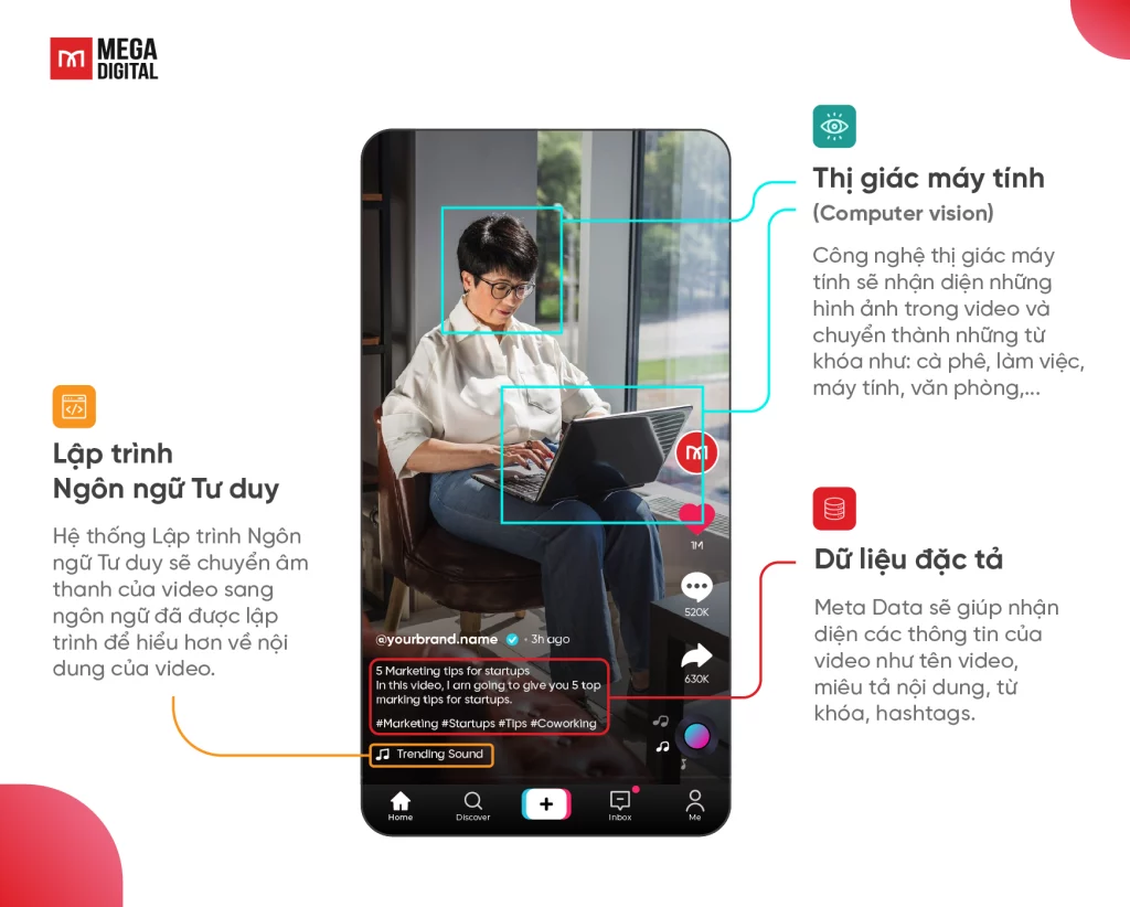 - Hashtag: Dùng để phân loại topic và thông báo cho thuật toán của TikTok về nội dung của video. Ví dụ: #MegaDigital #TikTokMarketing thay vì chỉ #fyp.